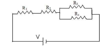 - In the circuit below, $\mathrm{R}_1$ and $\mathrm{R}_2$ are in series since current from the battery has to pass through both resistors. However, $R_3$ and $R_4$ are not in series since the current flowing through one is equal to the current in the other. After passes through $\mathrm{R}_2$, current can either take the path through $\mathrm{R}_3$ or the path through $\mathrm{R}_4$, making these two resistors in parallel. The majority of the current will go through the resistor with least resistance.