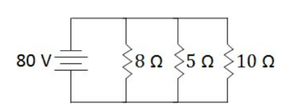 (a) $\begin{aligned} \frac{1}{R_{e q}} & =\frac{1}{8 \Omega}+\frac{1}{5 n}+\frac{1}{10 n} \Rightarrow R_{e q}=2.35 \Omega \\ I & =\frac{V}{R}=\frac{80 \mathrm{~V}}{2.35 n}=34 \mathrm{~A}\end{aligned}$