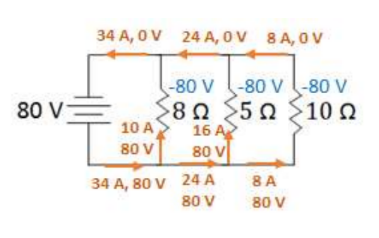The currents (10A+16A+8A) add up to the total circuit current, satisfying Kirchoff’s Current Law.