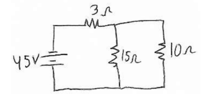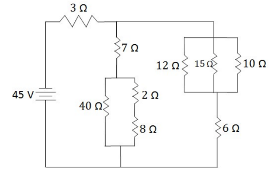 -The $12 \Omega, 15 \Omega$, and $10 \Omega$ resistors combine in parallel $(1 /(1 / 12+1 / 15+1 / 10))$