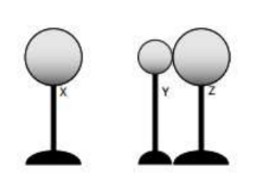 Example A: Three metal spheres rest on insulating stands as shown in the diagram at right. Sphere Y is smaller than Spheres X and Z, which are the same size. Spheres Y and Z are initially neutral, and Sphere X is charged positively. Spheres Y and Z are placed in contact near Sphere X, though Sphere X does not touch the other spheres.