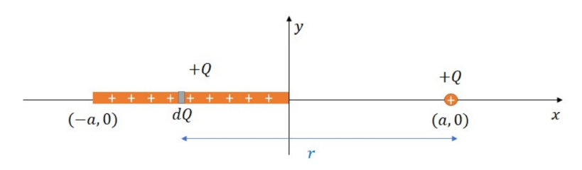 $\begin{aligned} & d F=\frac{k Q \lambda d x}{r^2} \rightarrow d F=\frac{k Q \frac{Q}{a} d x}{(a-x)^2} \\ & \rightarrow F=\frac{K Q^2}{a} \int_{-a}^0 \frac{d x}{(a-x)^2} \rightarrow F=\frac{K Q^2}{a}\left(\frac{1}{a-x}\right){ }_{-a}^0 \rightarrow F=\frac{k Q^2}{a}\left(\frac{1}{a}-\frac{1}{2 a}\right) \\ & \rightarrow \boldsymbol{F}=\frac{\boldsymbol{k} Q^2}{\mathbf{2 a}}\end{aligned}$