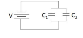 In series, a negative charge flows to $\mathrm{C}_1$ and a positive charge flows to $\mathrm{C}_2$. The region between the capacitors will remain neutral. In series, each capacitor stores the same amount of charge.