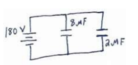 (c) Since the $3 \mu F$ capacitor has $120 \mathrm{~V}$ across it, the $6 \mu F$ capacitor has $60 \mathrm{~V}$ across it since they must add to 180
