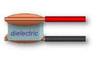 Example A: A $275 \mu \mathrm{F}$ capacitor will be manufactured using a dielectric having a permittivity of $4.00 \varepsilon_0$ and circular plates having a diameter of $2.50 \mathrm{~cm}$. What should the plate separation (and the thickness of the dielectric) be? Is it likely that this large a capacity could be constructed using parallel plate architecture?