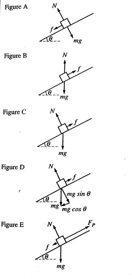 A small box is on a ramp tilted at an angle above the horizontal. The box may be subject to the following forces: frictional (ƒ), gravitational (mg), pulling or pushing \((F_p)\) and normal (N). In the following free-body diagrams for the box, the lengths of the vectors are proportional to the magnitudes of the forces.