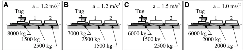A tugboat is pushing two barges (labeled 1 and 2) so that they speed up. The masses of the tugboats and barges and the accelerations of the systems are given for each case. Ignore the effects of fluid friction.