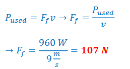 Since the speed of the cart is constant, power can be set equal to force times velocity (this is only true for instantaneous power or when velocity is constant). Since the force of the motor and the force of friction are equivalent the following substitution can be made to solve for the force of friction: