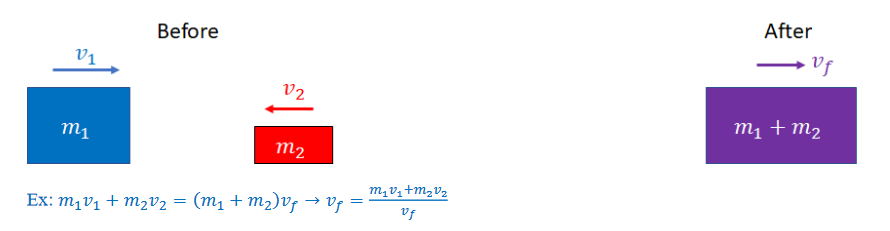 Conservation of momentum: 𝑚𝐴𝑣𝐴𝑖 + 𝑚𝐵𝑣𝐵𝑖 = 𝑚𝐴𝑣𝐴𝑓 + 𝑚𝐵𝑣𝐵𝑓