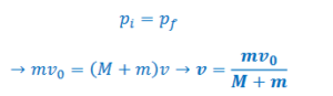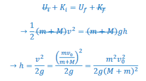 Example B: The Ballistic Pendulum – A bullet of mass m is fired with a speed of v0 into a block on pendulum of mass M. Find the height the pendulum reaches above its starting position.