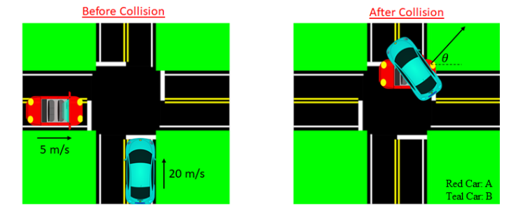 Example C: A 2–D Collision – A 1000 kg car moving north at 20.0 m/s collides with 2000 kg car moving east at 5.0 m/s. The two cars stick together. In what direction and with what speed do they move after the collision?