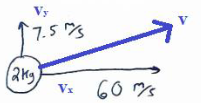 \(V_{y}=\frac{(1000kg)(20 m/s)}{1000 kg + 2000 kg}=6.7 m/s\) \(\theta =tan^{-1}\left ( \frac{6.7 m/s}{3.3 m/s} \right )=63^{0}northeast\)