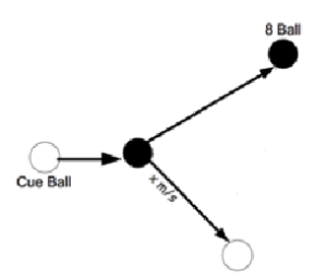 Example B: 2D Elastic Collision – A billiard ball travels at 15 m/s collides perfectly elastically with an identical billiard ball that is stationary. The stationary ball moves off on a path that makes an angle of 60o with the moving ball’s original velocity. Find the speed of each billiard ball after the collision.