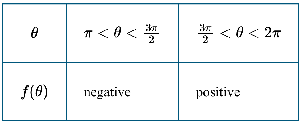 The table shows $f(\theta)$ changing from negative to positive across these intervals.