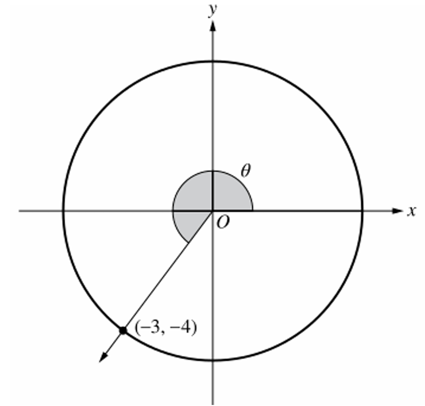 The terminal ray intersects the circle at the point $(x, y) = (-3, -4)$.
