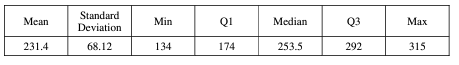There do not seem to be any outliers in the distribution. The distribution seems to be bimodal and fairly symmetric. The IQR of the distribution is between 50 and 150 .