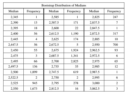 Emma ran the bootstrap process, and the following frequency table is the bootstrap distribution showing her results of generating 15,000 medians
