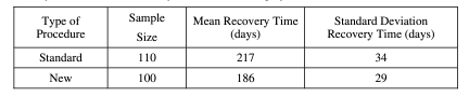The anterior cruciate ligament (ACL) is one of the ligaments that help stabilize the knee. Surgery is often recommended if the ACL is completely torn, and recovery time from the surgery can be lengthy. A medical center developed a new surgical procedure designed to reduce the average recovery time from the surgery. To test the effectiveness of the new procedure, a study was conducted in which 210 patients needing surgery to repair a torn ACL were randomly assigned to receive either the standard procedure or the new procedure.