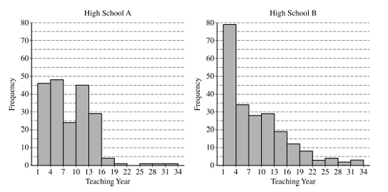 The following histograms summarize the teaching year for the teachers at two high schools, A and B.