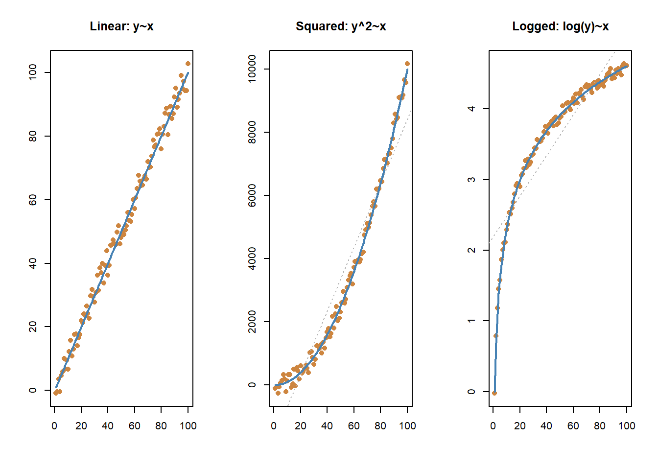 - Logarithmic: \( y’ = \log(y) \) or \( x’ = \log(x) \)