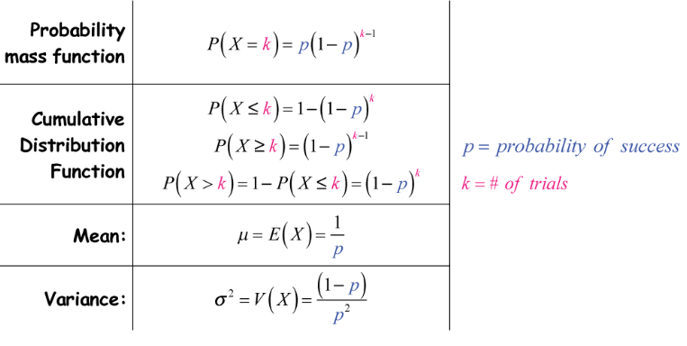- Variance: \( \sigma^2_X = \dfrac{1-p}{p^2} \)