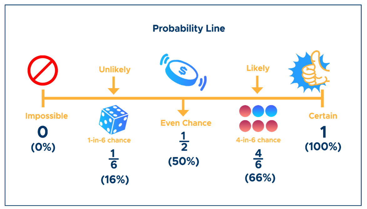 - Outcome: A possible result of a chance experiment (e.g., rolling a “4”).