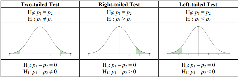 \(H_0: p_1 – p_2 = 0\) \(H_a: p_1 – p_2 \neq 0\) (two-sided)