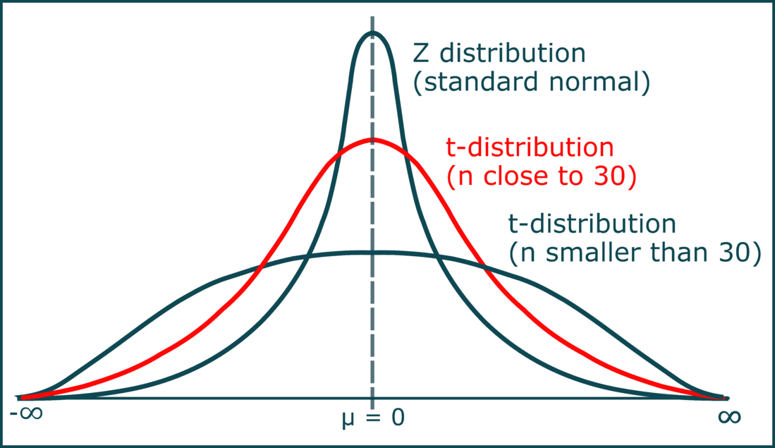 - Spread: Wider (heavier tails) than the standard normal distribution, reflecting extra variability from estimating \(\sigma\).