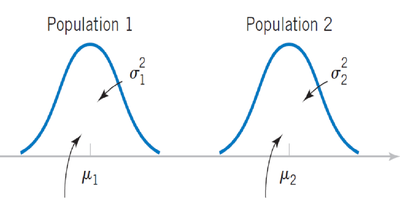 - Population 1: simple random sample of size \(n_1\), mean \(\bar{x}_1\), standard deviation \(s_1\)