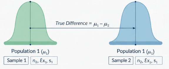 A confidence interval for \(\mu_1 – \mu_2\) provides a range of plausible values for the difference between two population means based on sample data.