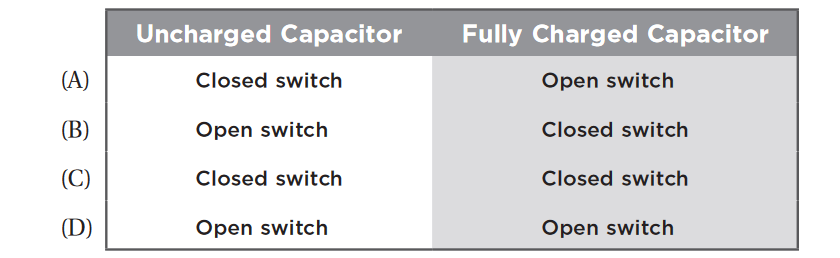 For an RC circuit, which of the following is the correct analogy for the instantaneous current behavior in a pathway containing a capacitor? Choose the option that would give the correct instantaneous current values in the capacitor’s path.