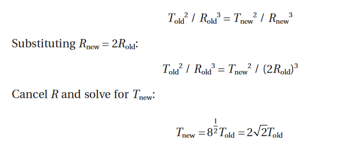 The Moon’s orbital period would increase by a factor of \(2\sqrt{2}\). Kepler’s third law of orbital bodies states that their orbital periods squared are proportional to their orbital