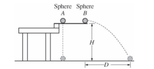 Two identical spheres are released from a device at time t = 0 from the same height H, as shown above. Sphere A has no initial velocity and falls straight down. Sphere B is given an initial horizontal velocity of magnitude v0 and travels a horizontal distance D before it reaches the ground. The spheres reach the ground at the same time tf , even though sphere B has more distance to cover before landing. Air resistance is negligible.