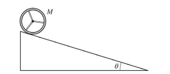 (b) For this ramp angle, the force of friction exerted on the wheel is less than the maximum possible static friction force. Instead, the magnitude of the force of static friction exerted on the wheel is 40 percent of the magnitude of the force or force component directed opposite to the force of friction. Derive an expression for the linear acceleration of the wheel’s center of mass in terms of M, θ, and physical constants, as appropriate.