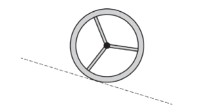 i. On the diagram below, draw and label the forces (not components) that act on the wheel as it rolls down the ramp, which is indicated by the dashed line. To clearly indicate at which point on the wheel each force is exerted, draw each force as a distinct arrow starting on, and pointing away from, the point at which the force is exerted. The lengths of the arrows need not indicate the relative magnitudes of the forces.