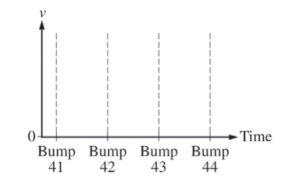 i. In the figure below, sketch a graph of the cart’s velocity v as a function of time from the moment it reaches bump 41 until the moment it reaches bump 44.
