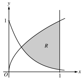Let $R$ be the shaded region bounded by the graphs of $y = \sqrt{x}$ and $y = e^{-3x}$ and the vertical line $x = 1$, as shown in the figure above.