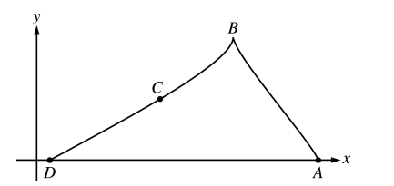 A particle starts at point $A$ on the positive $x$-axis at time $t = 0$ and travels along the curve from $A$ to $B$ to $C$ to $D$, as shown above. The coordinates of the particle’s position $(x(t), y(t))$ are differentiable functions of $t$, where
