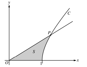 The figure above shows the graphs of the line $x = \frac{5}{3}y$ and the curve $C$ given by $x = \sqrt{1 + y^2}$. Let $S$ be the shaded region bounded by the two graphs and the $x$-axis. The line and the curve intersect at point $P$.