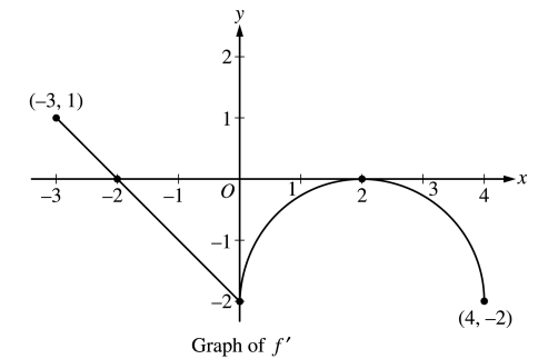 Let $f$ be a function defined on the closed interval $-3 \leq x \leq 4$ with $f(0) = 3$. The graph of $f’$, the derivative of $f$, consists of one line segment and a semicircle, as shown above.