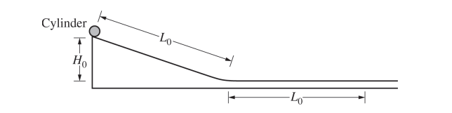 A cylinder of mass m0 is placed at the top of an incline of length L0 and height H0, as shown above, and released from rest. The cylinder rolls without slipping down the incline and then continues rolling along a horizontal surface.