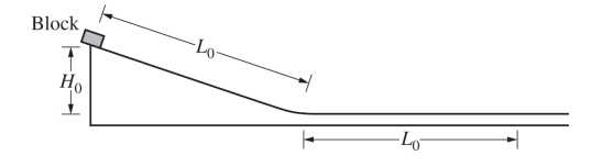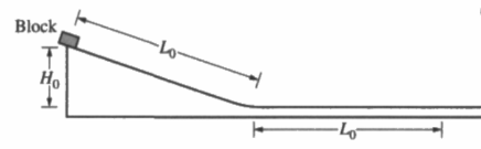 The cylinder is again placed at the top of the incline. A block, also of mass m0, is placed at the top of a separate rough incline of length L0 and height H0, as shown above. When the cylinder and block are released at the same instant, the cylinder begins to roll without slipping while the block begins to accelerate uniformly. The cylinder and the block reach the bottoms of their respective inclines with the same translational speed.