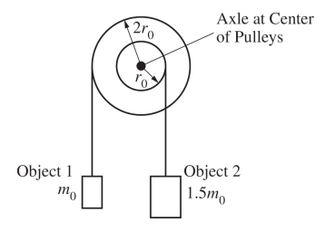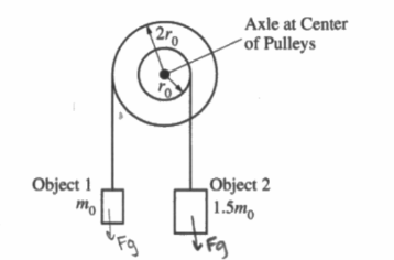 Two pulleys with different radii are attached to each other so that they rotate together about a horizontal axle through their common center. There is negligible friction in the axle. Object 1 hangs from a light string wrapped around the larger pulley, while object 2 hangs from another light string wrapped around the smaller pulley, as shown in the figure above.
