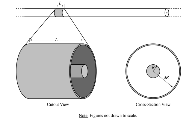 1. A very long nonconducting cylinder is surrounded by a thin concentric conducting cylindrical shell, as shown in the cutout view. A segment of length L of the inner cylinder has a net charge of +Q uniformly distributed throughout its volume. A segment of length L of the outer shell has a net charge of +4Q. The radii of the inner cylinder and outer shell are R and 3R, respectively, as shown in the cross-section view.