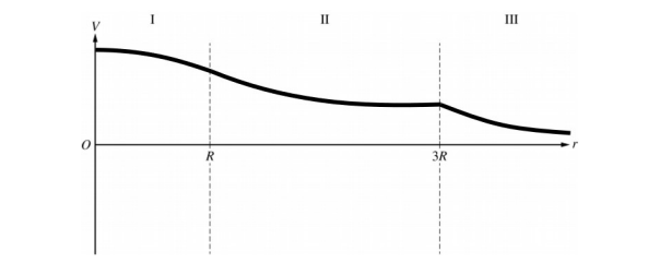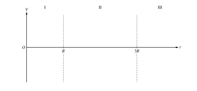 ii. On the following axes that include regions I, II, and III, sketch the graph of the electric potential V as a function of the distance r from the axis of the inner cylinder.