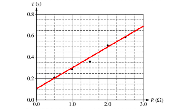 (c) The students determine the time constant \(\tau \) for the circuit as a function of the resistance R. The students’ data are shown in the following graph.