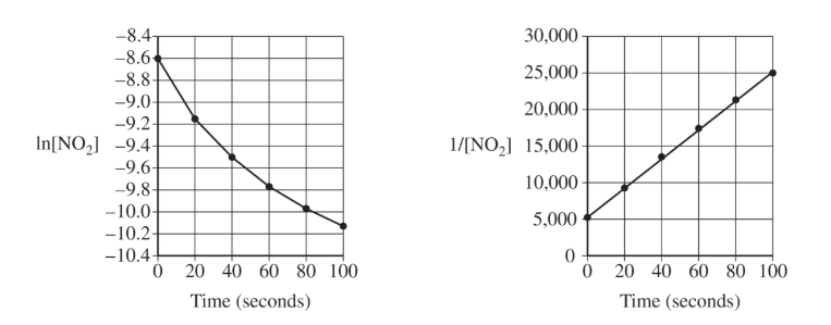The plot of \( \dfrac{1}{[\mathrm{NO_2}]} \) versus time is the most linear, indicating that the reaction is second order with respect to \( \mathrm{NO_2} \).