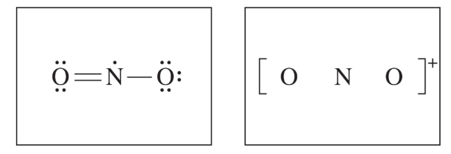 Agree. The angle of \( \mathrm{NO_2^+} \) is different from the angle in \( \mathrm{NO_2} \) because there would no longer be a nonbonding electron on the central atom in \( \mathrm{NO_2^+} \), and the oxygen atoms would spread farther apart, forming a linear structure with a \( 180^\circ \) bond angle.