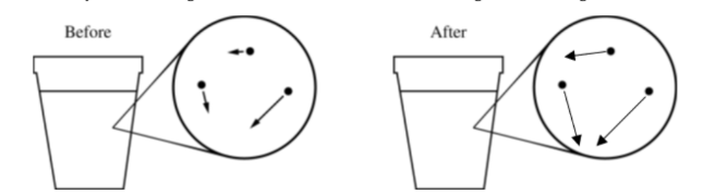 Because the metal is hotter than the water, thermal energy is transferred to the water, so the average kinetic energy and speed of the water molecules increase.