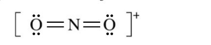 In \( \mathrm{NO_2^+} \), nitrogen forms two double bonds to oxygen and has no unpaired electron.